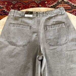 Add trendy style to your closet when you choose Brand new either tags No Boundaries women’s baggy wide leg jeans in grey denim with belt loops, a button and zipper fly closure, a 5-pocket design, wide legs, and a baggy fit. Style it with a cropped or a relaxed fit tee with thick-soled sneakers or boots.