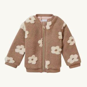 The Noppies Baby Tessie girls' jacket with sherpa flowers is adorable. It features long sleeves, a round neck, and an easy gold zipper closure.