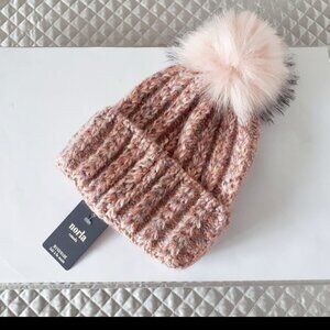 NWT Norla pink yarn knit faux fur pom pom beanie
