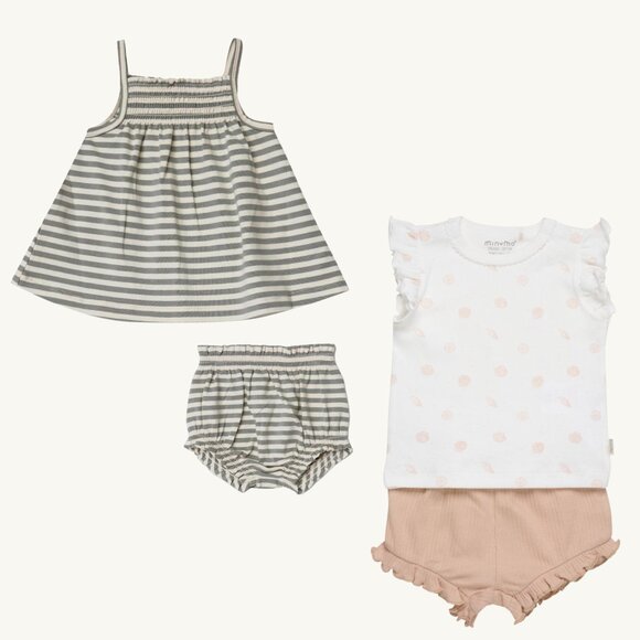 Both outfits are made from certified organic cotton, offering softness and comfort for warm days.