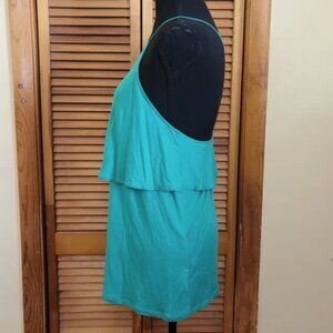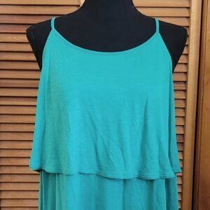 rounded halter high neckline, spaghetti straps, criss cross back strap, ruffle top detail, flowy loose fit, 100% rayon