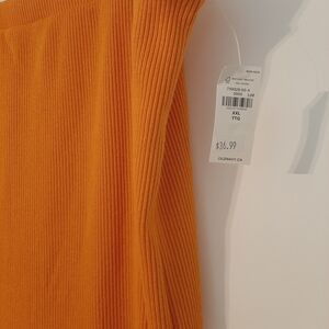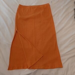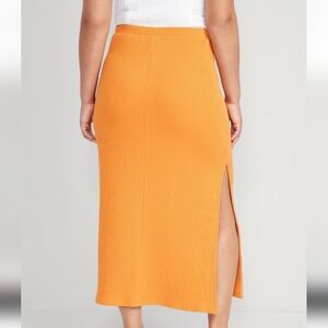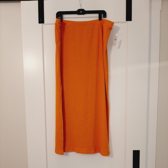 Pull-on rib-knit maxi skirt in a fun bright orange color.