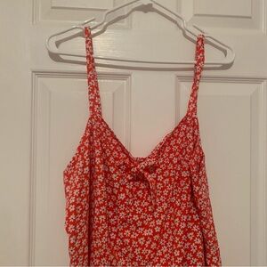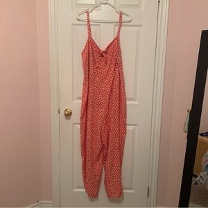 Easy, breezy one-piece jumpsuit with a bold floral print in red and white. Features a flattering V-neckline, cropped wide-leg silhouette, and spaghetti straps. Lightweight and perfect for warmer months.