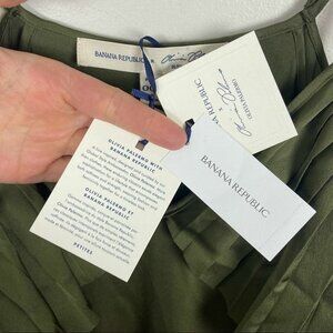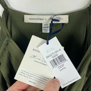 Pleated Off-The-Shoulder Maxi Dress in Olive Green. From Olivia Palermo's premier designer collection with Banana Republic. Women's size 00 petite. Dry clean. Side tie. Open shoulders. Brand new with tags! No flaws.