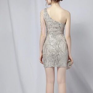 New with tag, one shoulder sequins mini dress, nude base with silver sequins, back zipper closure, front cutout accent.