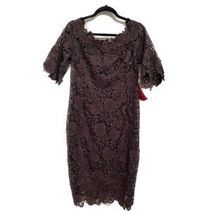 Gorgeous never worn dress by Paper Dolls. Flirty off shoulder style with crochet detailing, partially lined bardot neck, zip-back fastening, kick split in back and fluted sleeves. Size US 16, UK 20, but fits snug. Colour is "Charcoal Gray" but has a hint of purple.