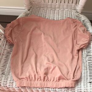 For summer this peach short sleeve crop top by Is ruched down the middle with an elastic hem so your crop does tide too high! Bust: 36” Waist: 27” Length: 14” Cotton.
