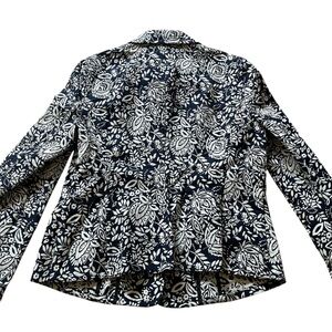 This elegant jacket from Pierre Cardin features a striking blue and white design with a notched collar and long sleeves.