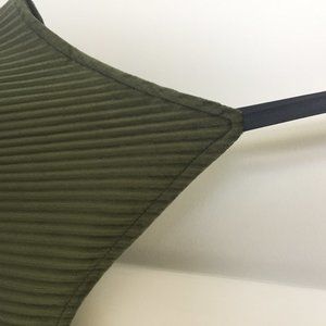 Cute little olive green dress by a Canadian desinger. Cuts just above the knee in a green velvet-like material with leather straps. Size LG shown pinned on model (size 8 for reference)