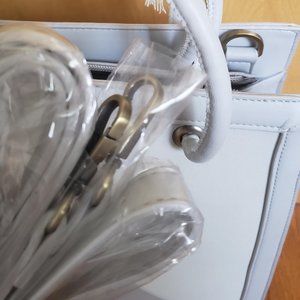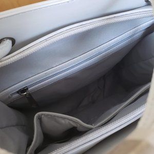 NEW/UNUSED light grey faux leather Pixie Mood tote with white faux suede accents .