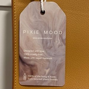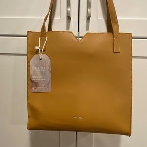 This is the Alicia mini tote in Honey, bag size 11"x11"x4", steps are 26" from end to end, make up travel bag size 10"x8". Made of vegan leather and lining is 100% recycled bottles. New with tag.