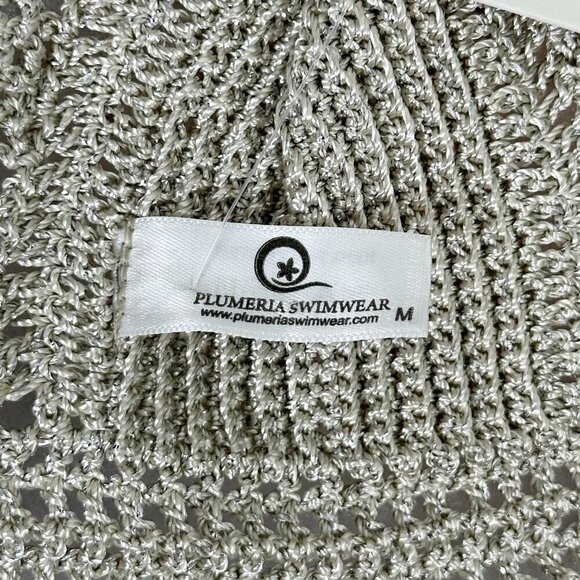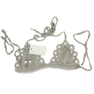 NWT Plumeria Swimwear Exuma Crochet Bikini Top. Light grey/silver top with metallic thread shot throughout. Mixed stitch with boho floral detail around cups. Tie halter and back. Materials: 100% Polyester. No known flaws.