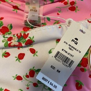 This is a classic triangle top with reversible pink and white strawberry fields print. Features added stitching detail along the sides. Does not come with removable padding. The bottoms are reversible and cheeky!
