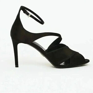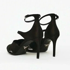 Pre-owned Prada black satin strappy heel featuring asymmetrical strap across vamp, crisscross straps at toe, adjustable ankle strap, a narrow rounded toe, and a covered stiletto heel.