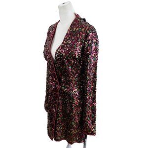 Stunning PrettyLittleThing sequin blazer dress in a rich multicolor palette of burgundy, pink, gold, green. Fully covered in shimmering sequins with a sleek tailored silhouette and deep V-front. Designed with an interior snap closure and full lining for comfort. A bold, glamorous piece perfect for parties, holidays, events, nights out, or any occasion that calls for sparkle.