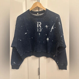 NWT R13 Cropped Distressed Crewneck Sweatshirt in Indigo Blue Paint | size S