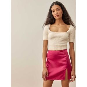 Heat things up. Shop the Robbie Silk Skirt from Reformation, a high rise, silk mini skirt with a side slit and a center back zipper.