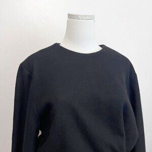 ROCKET X LUNCH BLACK WOOL BLEND FELT BELTED BLOUSON DRESS, this is the perfect fall and winter little black dress with the felt wool blend fabric all over, this is perfect for cold weather. Its unique design makes it look like a full dress white it feature and overlaying bodice that has the belt on the hemline to create the style you want, weather you want a boxy loose fit on the top or tie-it completely to create a blouson / sheath dress - with a round collar and long sleeve featuring tie-cuffs styling - a coordinated belt in an above the knee length, this makes it a mix of a party and a formal dress for many occasions making it versatile and a must in your wardrobe. It's fully lined and has a back zip, church and funeral appropriate, go to work or just have dinner with friends - go with high boots, classic black pumps or opaque stocking and booties.