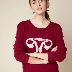 Meet Randy! Named after one of our favorite gynecologists, the Randy's Repro Knit boasts your favorite (public facing) uterus in a soft and light weight for year round wear. This original style blends the burgundy sweater with a pink & white intarsia reproductive system design. 10% of proceeds from this item will be donated to Planned Parenthood when purchased on their website.