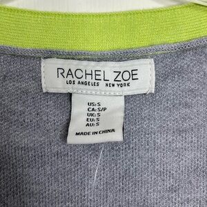 This bright green & grey knit cardigan is by Rachel Zoe. It features V-neckline with ribbed cuffs & trim & shiny silver buttons. Front welt pockets with buttons.