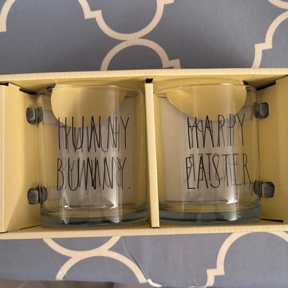 Charming Rae Dunn glass mugs with playful Easter messages. Ideal for festive gatherings. Brand new!