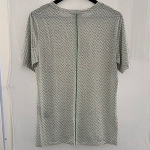 Sabeen is a slim-fit short sleeve in all-over ribbon print, made from a soft jersey with a touch of added stretch for comfort in movement. This silky T-shirt also features a signature railroad stitch details, merrowed center back seam.