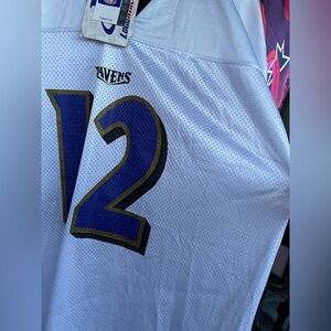 Rare vintage Vinny Testaverde football jersey. #12 for the Baltimore Ravens. Made by Logo Athletic in USA. Tags attached. Has the odd minor dark spot on it, which I haven’t tried to remove. Size large.