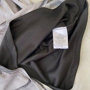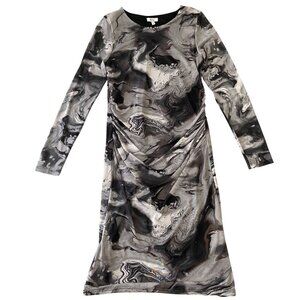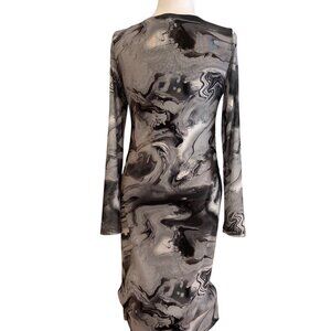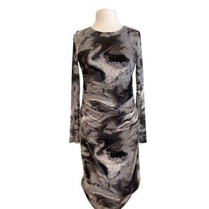 NWT stunning & feminine Reitmans sheer Womens Long-Sleeve Ruched Bodycon Dress Black & Gray Marble Print in size medium