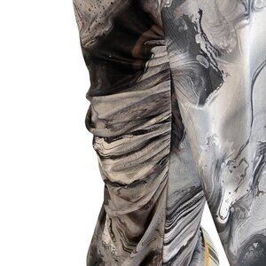 Item keywords: bodycon dress, marble print, women's fashion, long sleeve dress, elegant wear, ruched design, evening wear, formal dress, black and gray, mid-length dress, cocktail dress, party dress, artistic print, timeless classic, feminine, flattering,