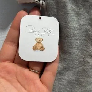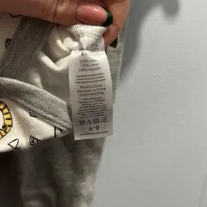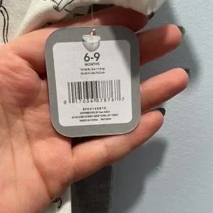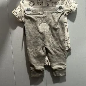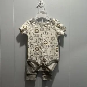 New with tags, wild cat pattern with lions, leopards and leaves. Comes with sweatpants with paw print on bottom as well as a matching bib. Bib attaches with velcro and onesie has snap enclosure on the bottom. Size large, fits 6-9 month infant.