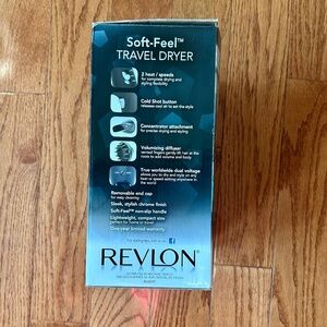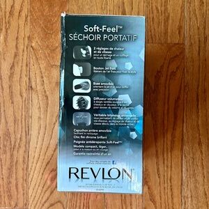 This brand new and in box Revlon Soft Feel Hair Dryer is perfect for use and home and for traveling. It has an easy grip handle. It has light and compact design. It comes with 2 heat and speed settings for complete drying and styling flexibility. It has a cold shot button to set the style. It has a concentrator attachment for precise drying and styling. It also comes with a diffuser attachment for volumizing and adding body. This dryer is ideal for domestic and international travel due to its worldwide dual voltage that allows you to dry and style on any heat or speed setting anywhere in the world.