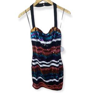 Revolve About Us Zoey Sequin Striped Mini Dress in Women's Size Small. Perfect little New Year's Eve Dress. All over sequin embellishment. Fully lined. Hand wash. Poly. Halter style neckline with loop button closure. Hidden back zipper. Brand new with tags! Note that one of the hanger straps is a bit loose but no other flaws.
