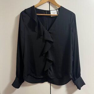 L'Academie Ruffle Blouse V Neck Long Sleeve Top Women's Size Small Black NWT