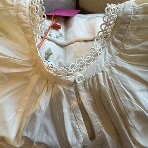 100% cotton. Beautiful edging and lace details. Button closure on back. Sold out and not available anymore.