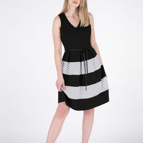 Description: Playful polka dots, pretty ribbon belt and criss-cross detailing add flirty, feminine fun to this pretty fit and flare dress. Summer party fun styled with shiny gold metal accessories and a cute heel. Machine washable. Stretchable.