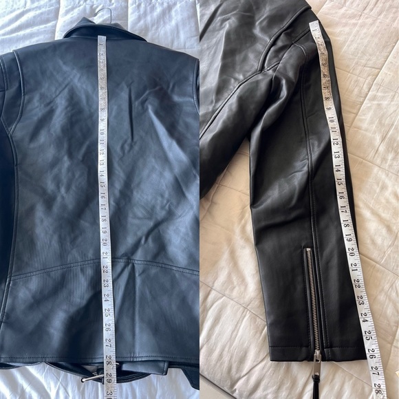 Fashionable biker jacket designed in a vegan leather finish with zip cuffs.