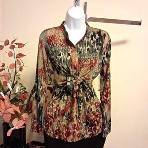 NWT Robert Kitchen Women's Burgundy Black Beige Printed Blouse Long Sleeve Top Well Design Tailored Spring Fall Blouse Tops Size M could fit for 8 or 10