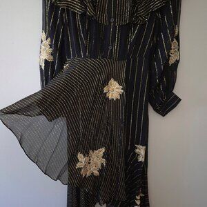 NWT Rococo Sand black & gold Laila metallic fibre stripe and floral / leaf embroidered asymmetrical hem maxi dress