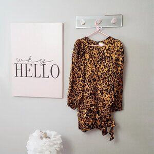 NWT Ronny Kobo Giorgia leopard animal print statement sleeve faux wrap mini dress, M