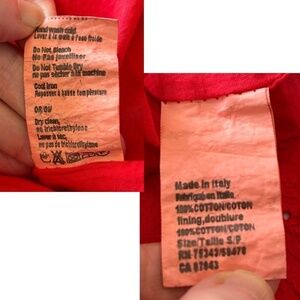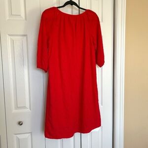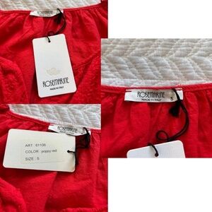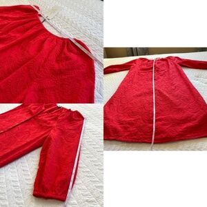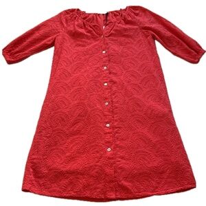 This gorgeous Poppy Red Eyelet Dress is Summer ready with a Boho Vibe. Made in Italy it is 100% Cotton with a paisley eyelet design. Bodice is lined in 100% Cotton. Hand Wash. Shell Button front adds to versatility and can be worn as a little topper when left open. Dolman 3/4 Sleeve with elastic cuffs, and gathered round neck. Size Small . Classic loose and straight fit. Approx flat measurements: Bust19” Waist19.25” Hip20.5” Hem22” Sleeve15.5” Shoulders15.5” Length 36”