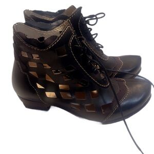 The boots are made of leather, typically in brown or black, and feature a lace-up closure. The cut-out pattern adds a distinctive, airy feel to the design, while the low heel provides comfort and stability. Rovers is a Portuguese brand known for crafting unique and beautifully designed footwear