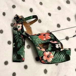 Platform, approx 5inch Heels black Green tropical Floral.