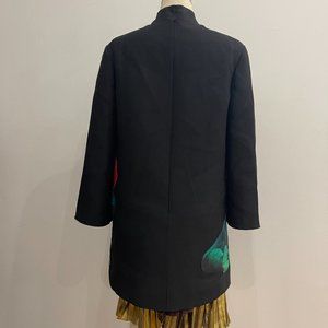 Valentino’s AW19 collection presents prints using 19th-century neoclassical sculpture of kissing lovers with images of roses, as seen in this black virgin wool-silk blend Valentino x UNDERCOVER Lovers embroidered shift dress. Featuring an a-line shape, a stand collar, an invisible back zip fastening, flared sleeves, a short length and a embroidery to the front.