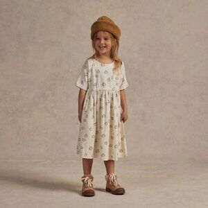 Rylee + Cru's Kat dress features an apple print with an elastic waistband. It features coconut buttons at the back and rolled-up dolman sleeves.