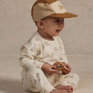 Long-sleeve relaxed fit sweater, made from the softest cotton. It features a gently curved hemline. Sizes 0-3 months to 6-12 months come with snap buttons at the shoulder for easy changing. 'Apples' print on ivory background.