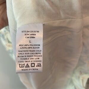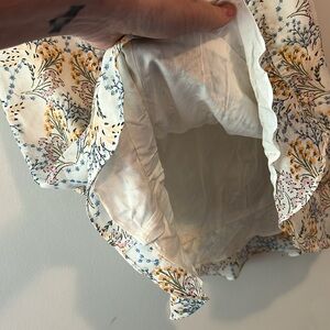Absolutely gorgeous dress, low V neck, ivory with floral pattern. Gathered front of skirt, ruffled bottom and side zipper.