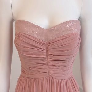 NWT SAMPLE Dessy 2904 size 10 Rose Lux Chiffon. Strapless dress with ruched centred bodice and full gathered flowy skirt. Has matching coloured sequin detail bordering neckline and around natural waist. Sequin trim is covered with a layer of chiffon to mute the shine. Very subtle. Fully boned bodice which give great support. Come with detachable spaghetti straps. Pristine Condition.