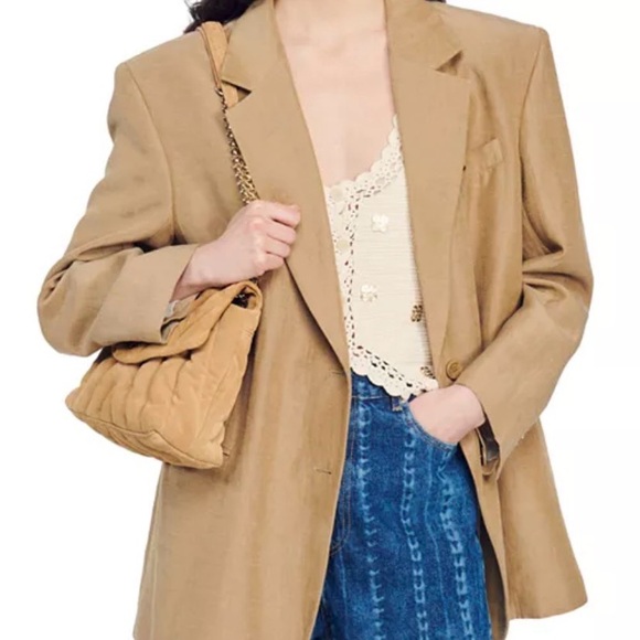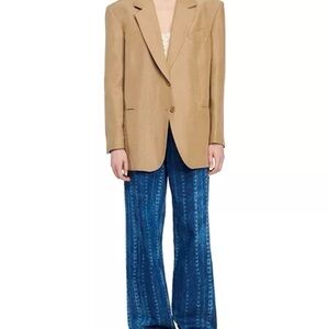 Relaxed oversized blazer from Sandro. Notch lapels and single-button style. Neutral camel tone for versatile wear. Polished, slightly structured silhouette.