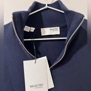 NWT SELECTED/ HOMME Mens 100% Cotton Quarter-Zip Sweater Navy, Size M