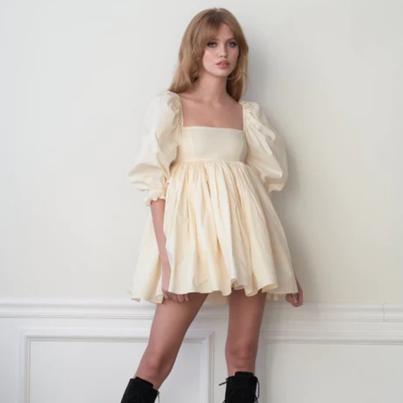 The sweetly gorgeous lamb puff dress by SELKIE is a pale creamy yellow (or slightly yellowy cream?) in 100% cotton with organza under layers. This uses the new size guide (so a 2X is a 2X) and the bust is lined. Washing: In cold water or dry clean.